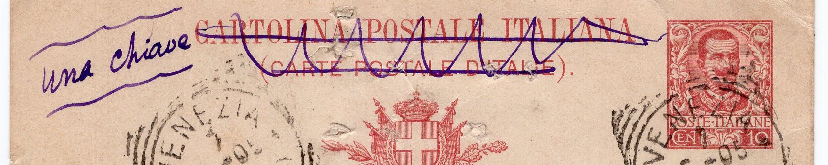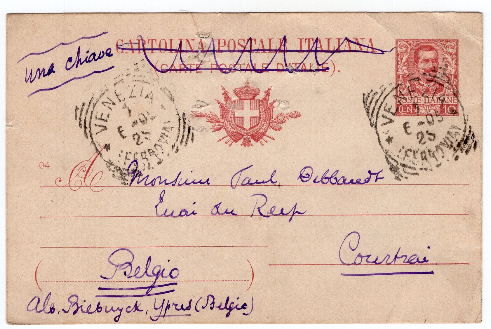 Cartolina postale inoltrata da Venezia a Courtrai (Belgio) il 7 giugno 1905, recante l’indicazione manoscritta “una chiave”.